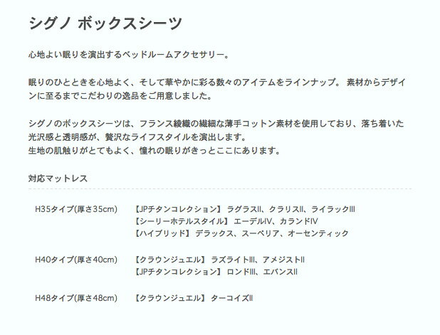 − S p e c i f i c a t i o n −H35タイプシングル:幅100×長さ200×高さ35cmセミダブル:幅120×長さ200×高さ35cmダブル:幅140×長さ200×高さ35cmダブルワイド:幅155×長さ200×高さ35cmH40タイプシングル:幅100×長さ200×高さ40cmセミダブル:幅120×長さ200×高さ40cmダブル:幅140×長さ200×高さ40cmダブルワイド:幅155×長さ200×高さ40cmH48タイプシングル:幅100×長さ200×高さ48cmセミダブル:幅120×長さ200×高さ48cmダブル:幅140×長さ200×高さ48cmダブルワイド:幅155×長さ200×高さ48cm※ボックスシーツ:全周ゴム入り綿100%、フランス綾織※H40・H48タイプは受注生産のため、お届けまでには4〜5週間のご猶予をいただきます対応マットレス:H35タイプ(厚さ35cm)【チタンコレクション】 ラグラスII、クラリスII、ライラックIII【シーリーホテルスタイル】 エーデルIV、カランドIV【ハイブリッド】 デラックス、スーペリア2、オーセンティック2H40タイプ(厚さ40cm)【クラウンジュエル】 ラズライトIII、アメジストII【チタンコレクション】 ロンドIII、エバンスIIH48タイプ(厚さ48cm)【クラウンジュエル】 ターコイズIIメーカー:Sealy(シーリー)送 料 【 A 】 運賃表お 願 い※納期は別途お問い合わせください。