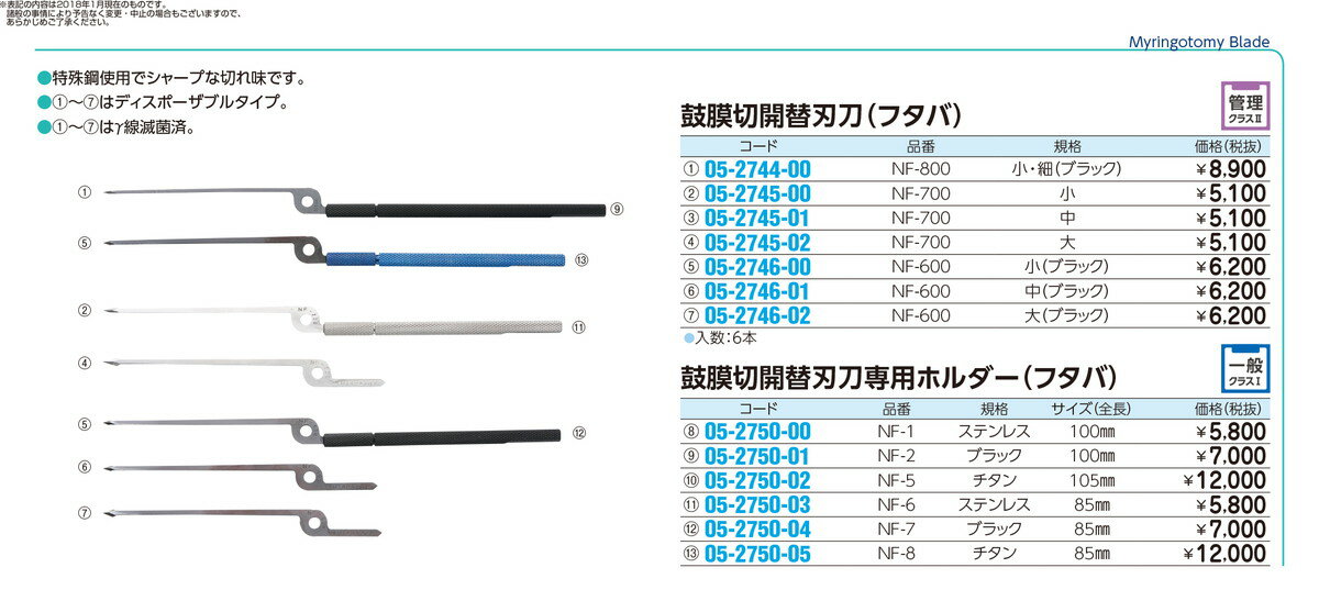 鼓膜切開替刃刀ホルダー(フタバ) NF-2ガタ(100MM)ブラック品番 05-2750-011入り 一般 手術室・中央材料室 手術用消耗品 定価\7000 JAN 4580311080367 ●定価¥7,000円(税別)●商品説明●特殊鋼使用でシャープな切れ味です。