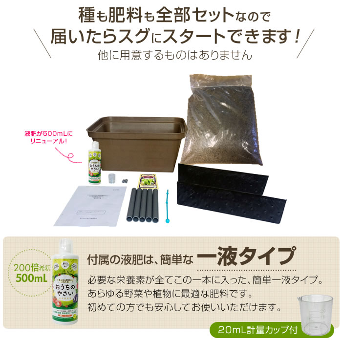 付属の肥料は、初めてでも簡単な一液タイプの液肥でしかも計量カップ付き!初めての方やズボラさんでも安心して野菜栽培をお楽しみいただけます。