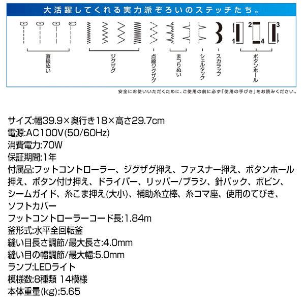 サイズ:幅39.9×奥行き18×高さ29.7cm電源:AC100V(50/60Hz)消費電力:70W保証期間:1年付属品:フットコントローラー、ジグザグ押え、ファスナー押え、ボタンホール押え、ボタン付け押え、ドライバー、リッパー/ブラシ、針パック、ボビン、シームガイド、糸こま押え(大小)、補助糸立棒、糸コマ座、使用のてびき、ソフトカバーフットコントローラーコード長:1.84m釜形式:水平全回転釜縫い目長さ調節/最大長さ:4.0mm 縫い目の幅調節/最大幅:5.0mmランプ:LEDライト模様数:8種類 14模様本体重量(kg):5.65■広告文責株式会社マツムラカメラ 076-242-1122区分:家電発売元:株式会社ハッピージャパン(ブランド:シンガーミシン)※使用感には個人差がございます。
